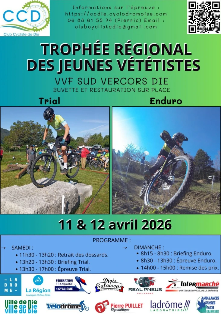 Bonjour et bienvenue à toutes et à tous. Rendez-vous de début de saison pour la Région Auvergne Rhône Alpes et nos jeunes Vététistes. Un super programme avec une épreuve de TRIAL le Samedi après-midi, et une épreuve ENDURO le Dimanche Matin. Près de 300 jeunes venu des quatre coins de notre belle région vont venir pour viser le podium afin de viser le Trophée de France.